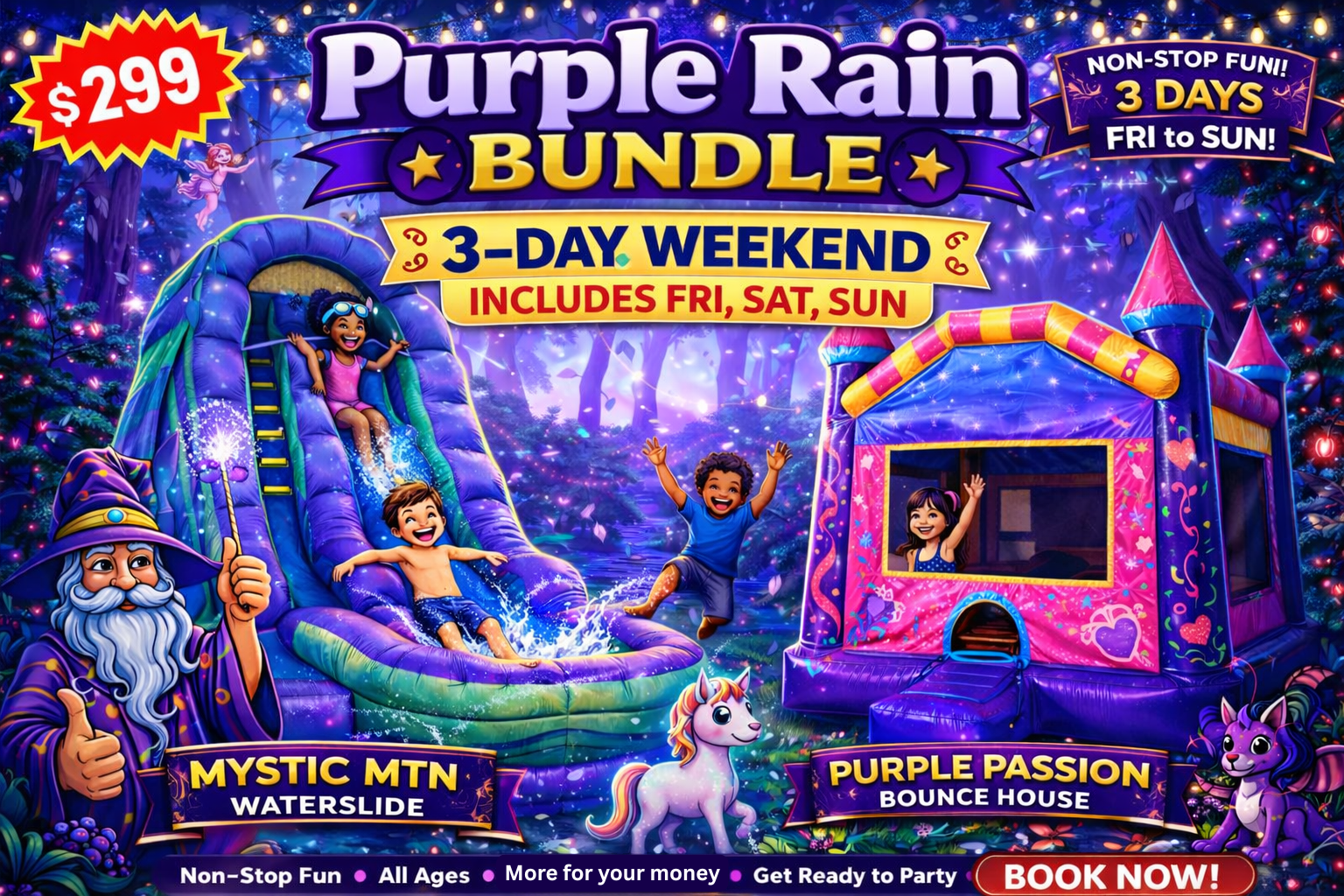 Can't decide between a bounce house or a slide? Don’t settle for just one! Explore our incredible combo options, each offering unique and exciting themes. Imagine a mad science lab with a Twister floor, an ambulance with a slide, a fire station where you slide straight into the truck, or a giant magical train that will captivate kids and adults alike. And that’s just the beginning.